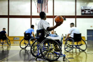 100413-A-7377C-012 – Army Spc. Craig C. Smith, a below-the-right-knee amputee and Operation Iraqi Freedom veteran recovering at Walter Reed Army Medical Center in Washington, D.C., gets ready to throw an outlet pass down court during a wheelchair basketball practice April 13, 2010, at Walter Reed. Smith and others recovering at Walter Reed are training for the inaugural Warrior Games May 10-14 in Colorado Springs, Colo. The games will feature Paralympic-style competitions to challenge disabled veterans and wounded active duty servicemembers.DoD photo by Army Sgt. 1st Class Michael J. Carden
